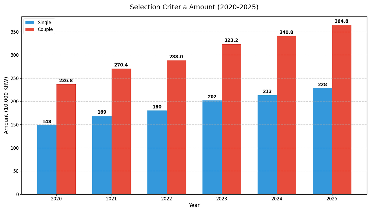 • 선정기준액: 단독가구 228만 원, 부부가구 364.8만 원