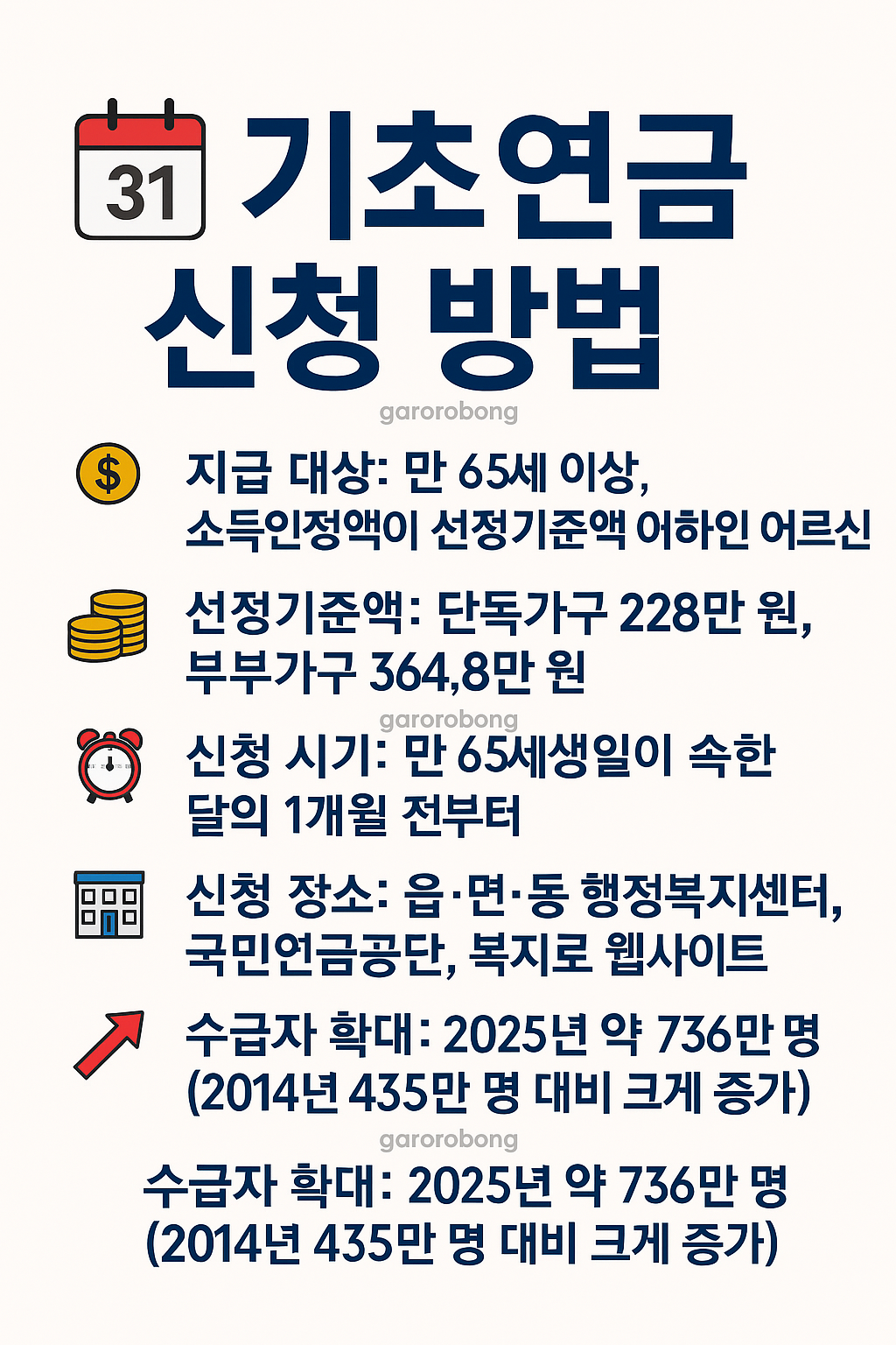 • 수급자 확대: 2025년 약 736만 명(2014년 435만 명 대비 크게 증가)