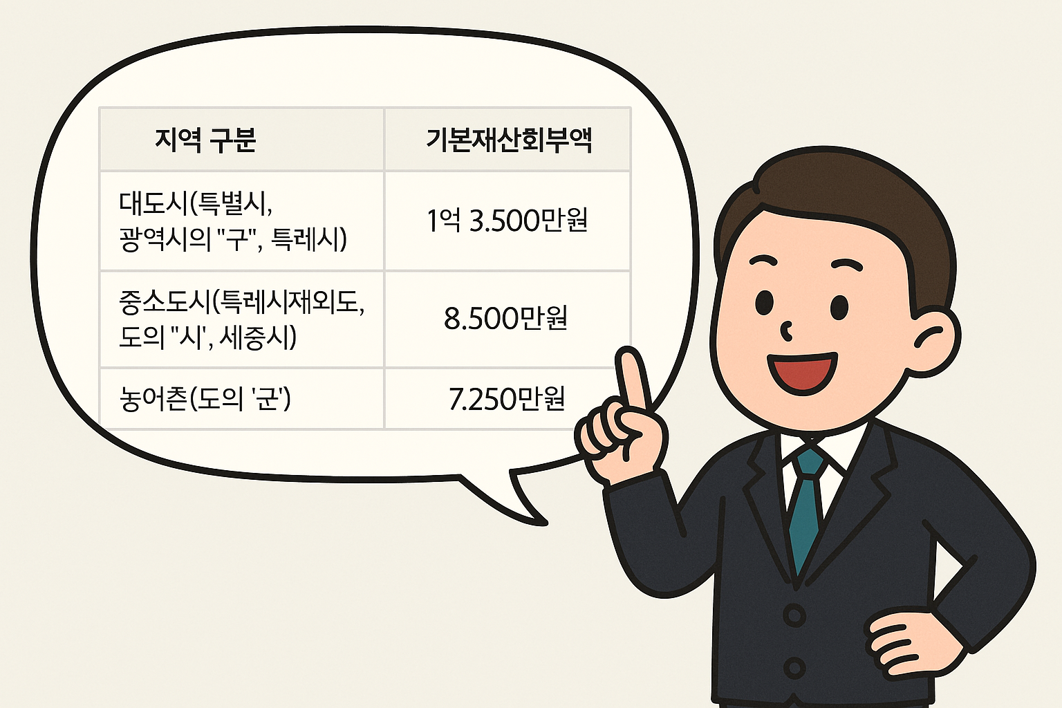 - 기본재산액 공제: 지역별로 차등 적용(대도시 13,500만원, 중소도시 8,500만원, 농어촌 7,250만원)