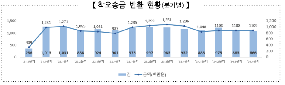 제도 시행 이후 '24.12월까지 집수된 착오송금 반환지원 신청은 총 46,954건(922억원)으로, 월 평균 1,118건(21.9억원)이 접수되었습니다. 이 중 수금인에게 반환된 착오송금은 총 12,542건(156억원)으로 월 평균 약 299건(3.7억원)이 반환되었습니다.