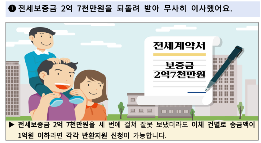 전세보증금, 물품대금 등 고액의 돈을 여러 번 잘못 보낸 경우에도 예금보험공사가 반환 절차를 도와드립니다. 개인이든 법인이든 상관없이 건당 이체금액이 1억원 이하라면 대부분의 착오송금이 지원대상이 됩니다.